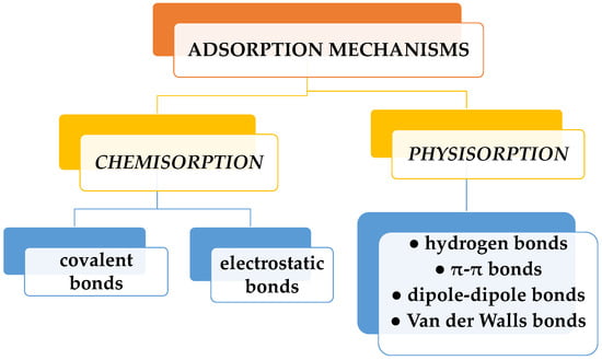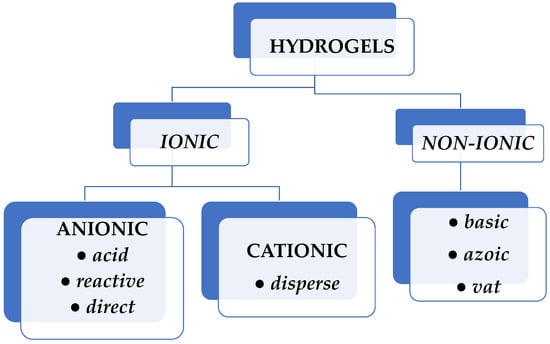Among these methods, the adsorption process stands out as the optimal alternative. It is a straightforward and cost-effective way with a brief analysis time and the generation of harmless secondary compounds. Because of its great efficacy and the potential for regenerating the adsorbent for multiple reuses, adsorption is widely recognized as one of the most popular and utilized treatment methods for dye removal [10,11]. Dye sorption can be physical or chemical (Figure 2). Physisorption is the process whereby dye molecules are adsorbed to a sorbent surface by weak forces (hydrogen bonds, dipole-dipole bonds, van der Waals, or π-π bonds). Chemisorption is the sorption achieved by chemical bonding (covalent or electrostatic). While physisorption can be reversed by the variation of different factors (heat, pH, pressure, etc.), chemisorption cannot be. Dyes are adsorbed at an active site on the surface of the adsorbent through electrostatic interaction, ion exchange, complexation, and/or chelation. Solution pH, initial dye concentration, functional groups, and adsorbent dosage in particular are external factors that mainly affect dye adsorption processes. The profitability of the adsorption process is given by the price of the sorbent and its efficiency. Thus, activated carbon, widely employed in water purification, is an excellent adsorbent, but its main drawback lies in its high cost [12]. It is used in pretreatment processes for the elimination of free chlorine and chloramines, and also serves to eliminate trace organic impurities from purified water. Instead, other sorbents, used in elimination of dyes in water, have a low price. These include unconventional materials such as clay products (bentonite, kaolinite, smectite, montmorillonite), zeolites, siliceous materials (alunite, perlite, sepiolite, attapulgite, silica beads), agricultural wastes such as peels, leaves, and seeds (bagasse pith, wheat straw, rice husk, sawdust, bark, sugarcane bagasse, cotton fiber), industrial waste items (waste carbon slurries, fly ash, red mud), and biomass (algae, fungi, bacteria). Hydrogels are polymeric materials most often used in dye adsorption, due to their structural characteristics.