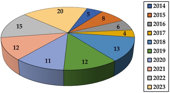 Figure 4. The number of papers concerning dye removal by natural polysaccharide-based hydrogels (2014–2023) (source Web of Science).