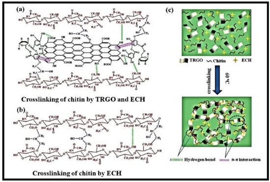 Figure 6. (ac) means the syntheses of chitin-TA modified with rGO (chitin-TRGO) composite hydrogels. Reproduced with permission from [68].
