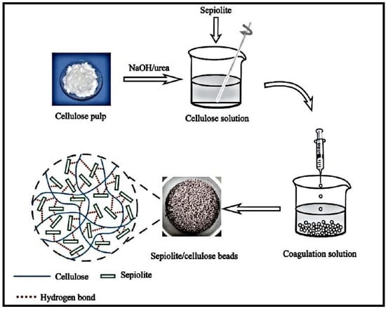 An organic-inorganic hybrid adsorbent based on cellulose and sepiolite (Sep), a fibrous magnesium hydrosilicate, was synthesized and used for the elimination of Malachite green (MG) dye (Figure 8) [99]. The hybrid was formed by adding pretreated Sep to cellulose dispersed in a NaOH/urea aqueous solution, followed by the dropping of the mixture into a diluted HCl-CaCl2 solution. The resulting hydrogel beads demonstrated great thermal strength because of the thermal isolation effect of Sep molecules.