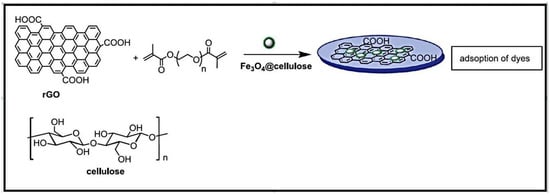 Magnetic hydrogels were synthesized by incorporating rGO and cellulose modified with magnetic nanoparticles into poly(ethylene glycol) dimethacrylate (PEG DMA)-based hydrogels by photo-polymerization (Figure 9) [101]. Cellulose, containing magnetic nanoparticles, was prepared by coprecipitation reaction of Fe2+ and Fe3+ in alkaline medium, followed by postcoating with the polysaccharide and rGO. The formed composites demonstrated high effectiveness in removing MB dye. The magnetic rGO-loaded hydrogel exhibited a high thermal stability, and could be regenerated without any reduction in its adsorption ability.