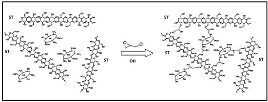 A composite hydrogel (chitin-TRGO), made from chitin, tannic acid (TA), and modified with reduced graphene oxide (rGO) through a freezing–thawing process, was used to remove CR dye (Figure 6) [68]. TA served as both a reducing agent and a surface modifier for rGO. The hydroxyl groups of chitin and the phenolic hydroxyl groups of TA interacted with rGO surface through π–π interactions, resulting in a cross-linking reaction with epichlorohydrin (ECH). The resulting composite showed improved mechanical strength and enhanced sorption properties in the formation of novel materials known as nanocomposites, endowed with enhanced properties.