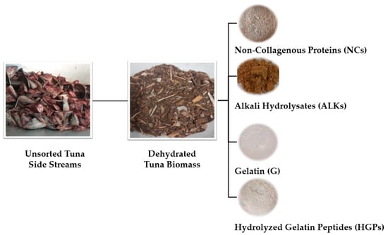 The samples of G and HGPs (Figure 2) were extracted from unsorted, mixed, and dehydrated crude tuna side streams.