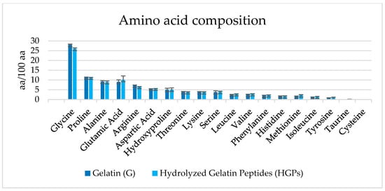 The most abundant amino acids in collagen are glycine, proline, alanine, and hydroxyproline. The glycine content was 28 and 26% for G and HGPs, respectively, while the quantities of the imino acids proline and hydroxyproline constituted, for both samples, around 16%, as was also observed by Cho et al. in gelatin extracted from skate (Raja kenojei) skins [19] and by Yang for gelatin hydrolysate coming from bones of the skipjack tuna (around 18%) [13]. In comparison with mammalian gelatin, the marine gelatin content in amino acids (proline and hydroxyproline) is lower, and this is the main reason why they present different physical properties [20] (viscosity, gel strength, and gelling point). Alanine and glutamic acid content represented about 10% in both samples of G and HGPs, followed by arginine at 7%.
