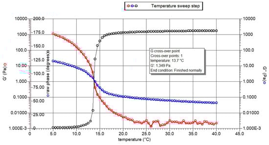 The gelling point of G, recorded at 13.7 °C, is represented by the temperature at which the elastic/storage modulus (G′, red curve) and the viscous/loss modulus (G″, blue curve) cross over while cooling from 40 to 5 °C.