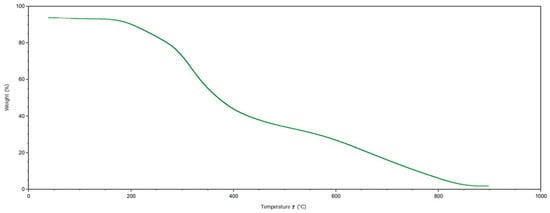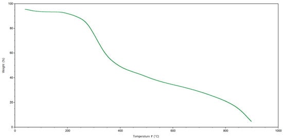 The TGA showed the loss of weight of the extracted samples as a function of temperature, and it defined their thermal stability; in Figure 6 and Figure 7, the TGA results for G and HGPs are reported. After the first weight loss due to the residual humidity as adsorbed and bound water [39], the trend of weight loss followed the thermal degradation of both G and HGPs starting from 200 °C. Then, a third step of degradation was probably linked to the degradation of organic salt. From the TGA analyses, it is possible to quantify the quantity of residual ashes and to make a comparison with the incineration performed with the muffle furnace. In the case of TGA, it can be seen that G exhibited a plateau between 850 and 900 °C, which corresponded to a residual ash mass of 1.8% against the result with a muffle of 3.1%, while HGPs showed the same results in both cases (4.5% and 4.6%) but with the difference that in their cases, the plateau was not visible. It can therefore be deduced that a complete incineration of G requires higher temperatures in the muffle, but not with TGA. On the other hand, HGPs may need a temperature above 900 °C to achieve the complete incineration in both methods.