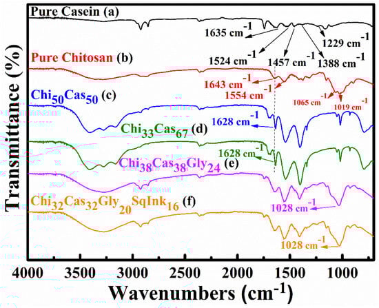 FTIR spectra of (a) pure casein, (b) pure chitosan, (c) Chi50Cas50, (d) Chi33Cas67, (e) Chi38Cas38Gly24, and (f) Chi32Cas32Gly20SqInk16.