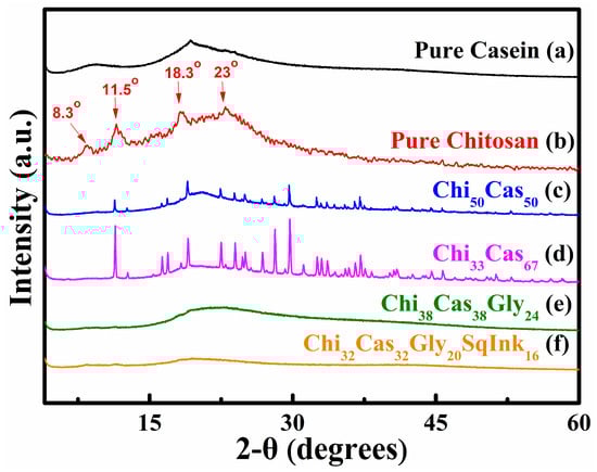 XRD diffractograms of (a) pure casein, (b) pure chitosan, (c) Chi50Cas50, (d) Chi33Cas67, (e) Chi38Cas38Gly24, and (f) Chi32Cas32Gly20SqInk16.