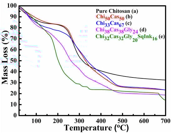 In Figure 3, TGA thermograms of the membranes of pure chitosan (Figure 3a), Chi50Cas50 (Figure 3b), Chi33Cas67 (Figure 3c), Chi38Cas38Gly24 (Figure 3d), and Chi32Cas32Gly20SI16 (Figure 3e) are presented in a temperature range between 20 and 700 °C. The initial mass loss observed from ~80 to 120 °C is attributed to the water loss from the membranes. The incorporation of casein in the blend Chi50Cas50 did not affect the thermal stability of the membrane, while the increase in its concentration (Chi33Cas67) seems to have destabilized the material at ~180 °C. The major mass losses in the samples of pure chitosan, Chi50Cas50, and Chi33Cas67 occur from 220 to 480 °C and are ascribed to the materials’ functional group decompositions. The major losses observed in the glycerol-containing materials start at lower temperatures, which is a phenomenon that was already observed and thoroughly analyzed in our previous work [,]. The remaining ~20–30% of the mass is attributed to remaining ash that has been carbonized and cannot decompose any further [,].
