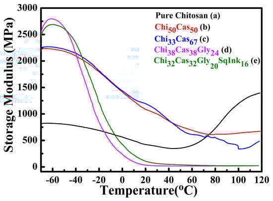 Dynamic mechanical analysis (DMA) was utilized to study the thermomechanical properties of the final membranes. In Figure 4, the results of the storage modulus as a function of temperature are illustrated for pure chitosan (Figure 4a), Chi50Cas50 (Figure 4b), Ch33Cas67 (Figure 4c), Chi38Cas38Gly24 (Figure 4d), and Chi32Cas32Gly20SqInk16 (Figure 4e). The thermomechanical properties of the materials were examined in the range between −70 and 120 °C. The addition of casein in the membranes Chi50Cas50 and Chi33Cas67 significantly increased the storage modulus of the materials in comparison to the pure chitosan membrane. On the other hand, the membranes Chi38Cas38Gly24 and Chi32Cas32Gly20SqInk16 showed decreased storage moduli due to the plasticizing effect of glycerol, while squid ink did not affect the mechanical properties.