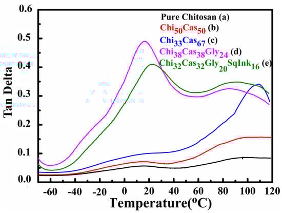 Tan delta plots of (a) pure chitosan, (b) Chi50Cas50, (c) Chi33Cas67, (d) Chi38Cas38Gly24, and (e) Chi32Cas32Gly20SqInk16.