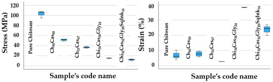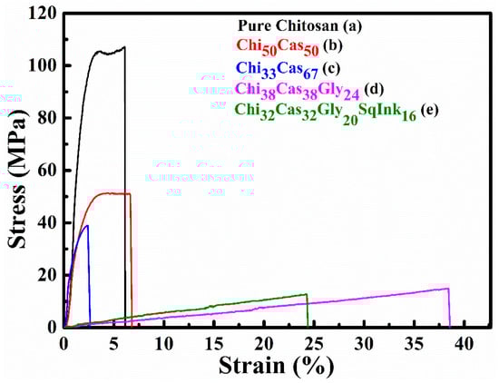 Indicative stress vs. strain plots of (a) pure chitosan, (b) Chi50Cas50, (c) Chi33Cas67, (d) Chi38Cas38Gly24, and (e) Chi32Cas32Gly20SqInk16.