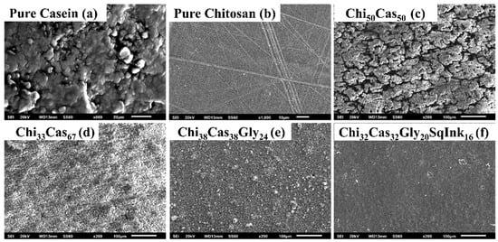 SEM images of (a) pure casein, (b) pure chitosan, (c) Chi50Cas50, (d) Chi33Cas67, (e) Chi38Cas38Gly24, and (f) Chi32Cas32Gly20SqInk16.