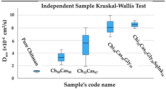 The obtained water vapor transmission rate (WVTR) values for the pure chitosan, Chi50Cas50, Chi33Cas67, Chi38Cas38Gly24, and Chi32Cas32Gly20SqInk16 membranes are summarized in Table 2. From these values, water/vapor diffusivity (Dw) values were calculated and are listed in Table 2 for comparison. As seen in Table 2, the incorporation of casein in the membranes led to an increase in the Dwv (water/vapor diffusion coefficient) values of the obtained Chi50Cas50 film. An increase in casein content in the Chi33Cas67 film led to a higher Dwv value. The results could be attributed to the water-binding properties of casein []. The casein-containing hydrogel membranes showed higher WVPs than the pure chitosan hydrogel. The results are in agreement with the scientific literature [], while the further increase observed in the WVP value after the addition of glycerol is normal due to the hydrophilic nature of glycerol. Squid ink further increased the Dwv of the Chi32Cas32Gly20SqInk16 hydrogel membrane. As an overall conclusion, we could say that the addition of casein or glycerol into the chitosan polymeric matrix led to lower water barrier. Nevertheless, according to the statistical analysis (Figure 9), pure chitosan’s mean water barrier is statistically equal to that of Chi50Cas50 or Chi33Cas67. The difference of the barrier mean value starts to be statistically significant with the addition of glycerol.