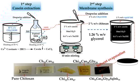 For the Chi32Cas32Gly20SqInk16 membrane synthesis, in a beaker containing 50 mL of distilled water and 2% (w/v) of extracted casein, 0.4% (w/v) of sodium hydroxide was added. The mixture was transferred to an ice bath, and it was sonicated using an ultrasonicator (UP100H, 100W, 30kHz, Hielscher Ultrasonics, Oderstraße 53, Teltow, Germany) for 5 min and then stirred until completely dissolved. While it was stirred, 2% (w/v) of chitosan was added into the solution, followed by an addition of 2% (v/v) acetic acid. The new solution was stirred for approximately 10 min. In the same beaker, 0.5 mL of glycerol was added, followed by an addition of 1% (w/v) squid ink. The final solution contained 1 g (2% w/v) of extracted casein, 1 g (2% w/v) of chitosan, 0.63 g (1.26% w/v) of glycerol, and 0.5 g (1% w/v) of squid ink. The solution was then transferred to polystyrene dishes to evaporate the solvent and form the membrane. The Petri dishes were left in room temperature overnight (around 18 h). For the preparation of all other materials, pure chitosan, Chi50Cas50, Chi33Cas67, and Chi38Cas38Gly24, a similar procedure was followed but without the additional step of the aforementioned method. All the samples were produced in triplicate. The abbreviations and quantities used in all the experiments are listed in Table 4. The synthesis is shown in Figure 10.