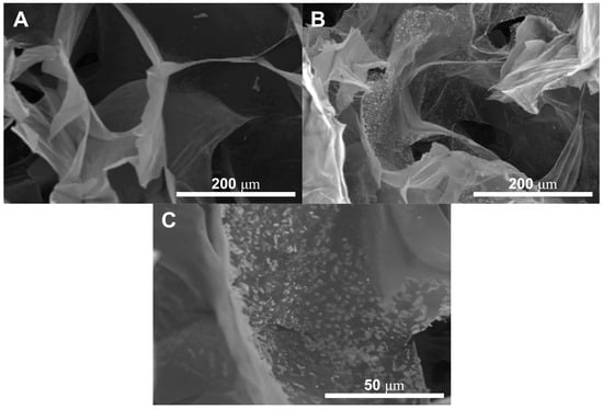 The presence of the HA nanoparticles has been confirmed by SEM through the comparison between (A) GG:PEG and (B) GG:PEG:HA20%:CK. The nanoparticles covered the scaffold surfaces. (C) Higher magnification showing the nanoparticles included in the scaffold surface. The particles appeared to be evenly distributed with the formation of several small agglomerates.