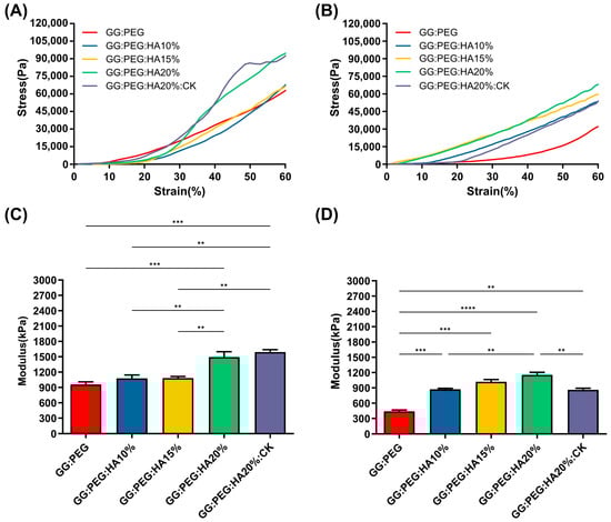 Stress–strain curve of (A) dry and (B) wet scaffolds, a clear reduction in the compressive modulus is visible. The trend of the compressive modulus is not immediately clear. (C) The compressive modulus for the dry sponges shows that both the addition of PEG and HA are significantly beneficial in terms of enhancement of the mechanical response. However, to see a significant effect, at least 20% of HA should be added to GG:PEG. The addition of CK does not affect the mechanical resistance in comparison with the bare scaffold. (D)The importance of the presence of the HA as filler became evident in wet conditions. In fact, the percentage of HA gave a significantly higher compressive modulus in comparison to the GG:PEG scaffold. Also, in this case, the addition of PEG was beneficial for the mechanical response of the scaffold. The inclusion of CK resulted in a decrease in modulus compared to the untreated scaffold, although it still remained higher than the modulus of the GG:PEG scaffold. The significance levels of the ANOVA test were assigned as follows: p ≤ 0.01 (**), p ≤ 0.001 (***), p ≤ 0.0001 (****). A difference was considered statistically significant if p ≤ 0.05.