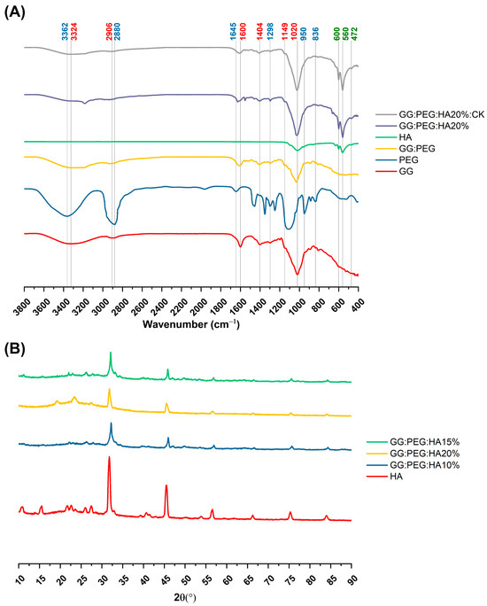 (A) FTIR spectra of the prepared scaffolds along with the basic material used (GG, PEG, HA, and CK), the different color of the label indicates the attribution of the specific peak to the material (GG black, PEG red, and HA green). (B) XRD spectra to verify the presence of the crystal phase of the HA in the composite scaffolds (HA, CK, control, 20% HA, and 20%HA:CK).