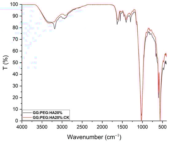 FTIR of GG:PEG:HA20% and GG:PEG:HA20%:CK scaffolds superimposed and normalized. Several peaks well-defined in GG:PEG:HA20% are less defined or not present in case of GG:PEG:HA20%:CK.In particular, a peak located at 3185 cm−1 and one located at 1552 cm−1 which is less pronounced than the effect of the presence of CK. This may indicate a chemical interaction among CK and the scaffold.