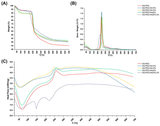 Thermal analysis of the scaffolds. (A) TGA and its correspondent (B) first derivative. Only some contribution could be clearly distinguished, and the GG:PEG scaffold was the one that lost the highest weight due to the absence of HA. (C) DSC analysis—while almost all the samples had the same curve, the sample containing CK was distinguishable for the presence of a second endothermic peak.