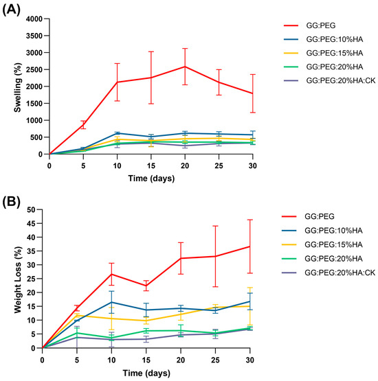 The percentage swelling and degradation were calculated and are reported in Figure 7A and Figure 7B, respectively. The numerical data are reported in Table 4. The GG:PEG scaffold exhibited a considerably greater swelling ratio compared to all other scaffolds at all time intervals, and decreasing swelling was directly proportional to the amount of added HA. In particular, at day 30, the swelling of GG:PEG was nearly 1800% (so the amount of PBS adsorbed was 18 times the initial weight of the scaffold), while the scaffold with 20% of HA added had a swelling of 340% (3.4 times the initial scaffold weight). This decreasing of the swelling ratio was mainly related to the HA hydrophobicity and is a well-documented phenomenon in the literature [65,66].