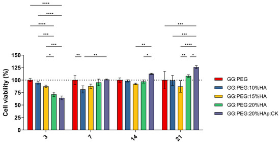 A preliminary in vitro assessment was conducted using the MTT assay on ADSCs cultured on scaffolds and evaluated at 3, 7, 14, and 21 days. The obtained results are shown in Figure 8. The result of the statistical test was reported in Table S1. The GG:PEG scaffold showed significantly higher cell viability after 3 days compared to almost all other scaffolds that included HA. This result was similar to what was already observed in the literature where in other scaffolding systems, in which the HA particles were combined with biomaterials in the first days the scaffold without HA, had better results [67]. This result may be explained by considering the higher swelling ratio on the GG:PEG that allows a higher circulation of nutrients in the first few hours, but also with the direct effect of the presence of HA that partially changes the scaffold surfaces (as shown in Figure 2). At days 7 and 14, the scaffold with the addition of HA showed a response similar to the GG:PEG scaffold with the exclusion of the GG:PEG:HA10% scaffolds that, at day 7, had a cell viability significantly lower than GG:PEG and GG:PEG:HA20%:CK. After 14 days, the scaffold GG:PEG:HA15% resulted in a cell viability lower than GG:PEG:HA20%:CK. At day 21, the samples with the addition of CK showed a significantly higher cell viability than all the other prepared scaffolds, demonstrating that the addition of CK to be beneficial requires at least 21 days. Furthermore, we gathered SEM images at this specific time point (Figure S2), and the trend observed in the MTT assay was also visible in the images. This result well aligns with the limited prior research on the topic, which integrated CK into different scaffolding systems and in which no proved effect of CK on cells was observed in the short term [68,69].
