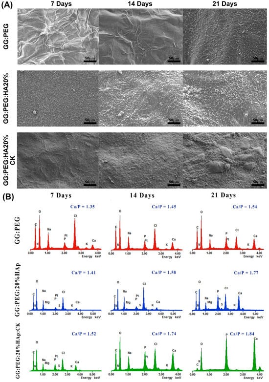 The precipitation of calcium and phosphate on the prepared scaffolds were analyzed via incubation in SBF for a period of 21 days. The changes in the surface morphology are shown in the SEM micrographies of Figure 9A. In this case, we tested only the scaffold that gave us the best results in terms of cells viability (GG:PEG:HA20%:CK) versus the correspondent scaffold without CK (GG:PEG:HA20%) and the control (GG:PEG). Both scaffolds with the presence of HA showed a higher mineralization compared to the control in all the tested time points (7, 14, and 21 days). This effect is well known in the literature; in fact, the presence of the HA particles acts as a nucleation center for mineralization. The mineral deposition growth is demonstrated between 7 and 21 days of incubation by the modification in the scaffold morphology. The mineral crystal formation was evenly distributed across the surfaces of the scaffold. The EDX qualitative analysis of Ca-P ratios is reported in Figure 9B. The Ca-P ratio increased with time and moving from the control to the bare scaffold and to the scaffold with the addition of CK. The higher Ca-P ratio was obtained after 21 days for the GG:PEG:HA20%:CK scaffold.
