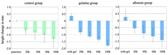 After the injection of the gels, the height of the specimens in the gelatine group increased, with a median value of 0.34 mm (0.05–0.56 mm), and the height of the specimens increased in the albumin group with a median value of 0.27 mm (0.01–0.80 mm). In contrast, in the control group, needle puncture alone did not lead to a height change (Figure 1).
