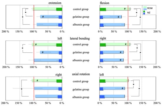 ROM and NZ after treatment (needle puncture in the control group and gel injection in the gel groups) of each group (n = 6), which were normalized to the respective intact state (100%, red line). # shows significant differences between intact condition and after first treatment within each group (p < 0.05; Wilcoxon Signed Rank test). * shows significant differences between control group and gel groups (p < 0.05; Wilcoxon Mann–Whitney test).