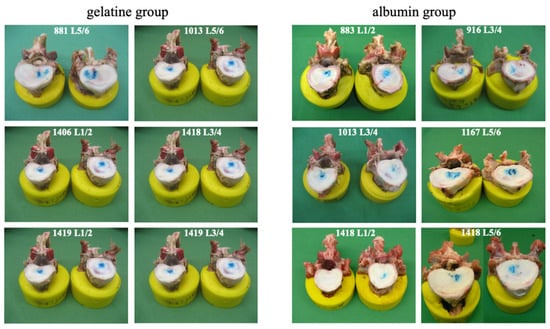 For macroscopic inspection and the final evaluation, the specimens were cut transversally at the level of the injection canal. The central injection into the disc was assessed and the gel distribution was inspected.