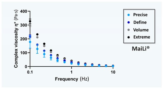 ® product variants were experimentally determined. Specifically, complex viscosity η* values (i.e., in oscillatory rheology) were determined for each dermal filler variant as a function of the applied oscillation frequency (