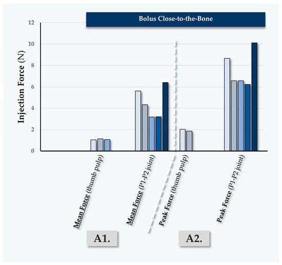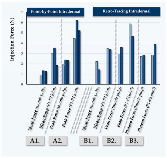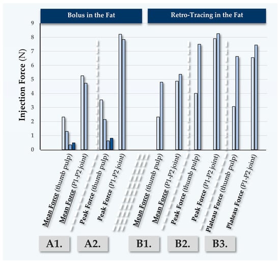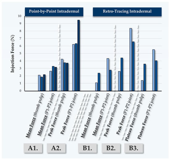 Table 1). Notably, it was observed that hypodermal bolus injections by injector PM were comparatively less homogeneous and required more force, which was attributed to the use of the P1–P2 thumb joint for the injections. Additionally, these relatively high force values were correlated with the lower clinical experience level of injector PM with volumizing agents (