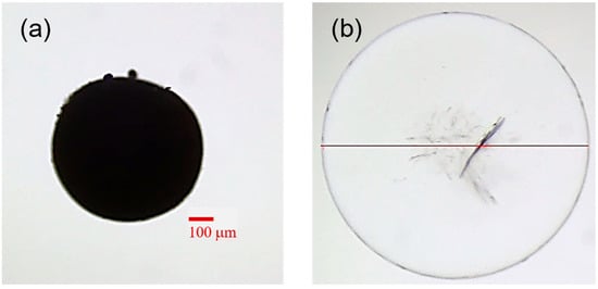 Optical microscopy images of a dry starch microsphere (a) and the same particle after hydration in MQ water (b). The line in figure (b) illustrates calculation of the particle diameter.
