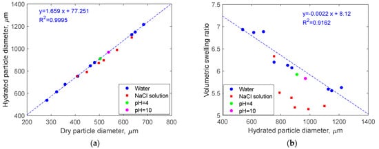 Moreover, DSMs in the presence of water undergo a swelling process that significantly changes the size of the microspheres. The size of hydrated particles as a function of the same particle size in the dry state is shown in Figure 2 and Table 1. Clearly, an excellent linear correlation is observed (Figure 2a). The trend line, however, does not start from the origin point (0, 0), but rather closes the y-axis at a positive value.