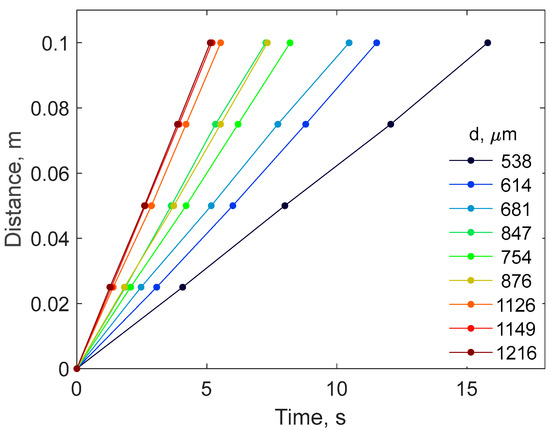From the sedimentation experiment, it was possible to measure the steady-state sedimentation velocity of the particles. In particular, the velocities of nine particles were analyzed, taking into account the distance the particles traveled inside the cylinder and the time it took them to reach the bottom. The speed of the particles was calculated considering a base distance of 0.10 m travelled by the particles inside the lower part of the cylinder, where the particle practically approaches the steady state. Figure 3 shows that the velocity at which individual DSM particles settle in the aqueous liquid inside the cylinder is constant, which confirms that the steady-state velocities are achieved. On the other hand, the observed velocities depend on the particle size. In particular, the larger the particle, the steeper the slope of the straight line. The obtained values of velocities are shown in the Supporting Information (Table S1).