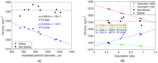 The obtained density values had a mean value of 1051.5 kg/m3, with the standard deviation of 3.6 kg/m3 (or rounding to one significant digit, 1052 ± 4 kg/m3). The dependence of particle density on the hydrated particle diameter is shown in Figure 4 (black circles). The first point on the plot substantially deviates from the rest; on the other hand, its deviation from the density mean value is only 0.6%. Unlike the case of a Stokes’ law-based approach, the dependence on the particle diameter is flat and a very low value of R2 further confirms the absence of correlation with the particle size. The two linear regressions presented in Figure 4 suggest that at lower practice sizes (tens rather than hundreds of microns), both methods would provide relatively similar results. Overall, the results presented here demonstrate a good consistency and a practical accuracy of the method based on the non-Stokes drag coefficient.
