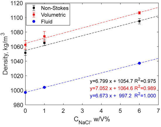 The analysis shows high Reynolds number values (Re > 10); therefore, the density of the starch microspheres was calculated using Equations (4)–(6) using literature values for the viscosity (0.00089 and 0.000972 Pa∙s) and density (1004.03 kg/m3 and 1037.19 kg/m3) of 1 and 6 w/v% salt solutions, respectively [18,19]. The results show an increase in particle densities compared to the values obtained using milli-Q water. The main part of this increase comes, however, from the increase of the density of fluid. This is clear from Figure 5, where the three linear regressions have very similar slopes.