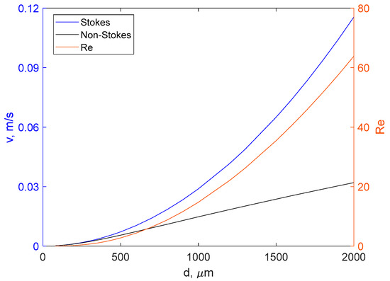 The sedimentation rate of spherical particles in water calculated from Equations (4)–(6) and Stokes’ law using the density value of 1050 kg/m3 (left axis). Reynolds number as a function of particle size calculated for the same density (right axis).