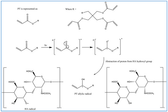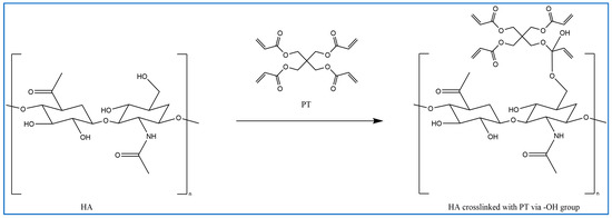 In previous studies, PT has been used as a crosslinker of polyethylene oxide (PEO) hydrogel films synthesised using UV radiation [29]. Other studies suggest that when PT absorbs energy from UV photons, its acrylate group generates reactive-free radicals, which initiates the crosslinking of repeated units of the polymer with PT radicals via recombination [29]. However, it is difficult to induce the free radicals on PT without adding a photoinitiator. Therefore, in this study, the reaction mechanism was described in most of the reactions where possible. Firstly, for UV- or heat-induced PT radicals, which abstract a hydrogen atom from HA to generate HA radicals for repeated HA units that recombine with PT radicals to form crosslinks despite the absence of an initiator in the procedure, PT possibly forms free radicals at a higher temperature [30,31,32] (Figure 2). The crosslinking of PT and HA radicals could occur via the hydroxyl (-OH) group of HA and the carboxylic (-COOH) group of the PT. However, with this suggestion, the pH turns alkaline without any input, which is improbable. The second suggested mechanism is that when PT is activated by -OH as nucleophiles generated under alkaline conditions, they generate electrons or protons via a Michael reaction (Figure 3). The other possible reaction suggested is the acrylation of HA under an alkaline condition similar to the methacrylation process, which successfully occurs by activating a carbon–carbon double bond [32] (Figure 4). Since a reaction between HA and PT has not been reported before, we explained the most acceptable reaction mechanisms. However, the injectable hydrogel/filler formulation was suggested to be partially crosslinked. Lastly, to achieve our aims, we intend to perform a future follow-up and continue to conduct more comprehensive in-depth research on the mechanism of this new crosslinking reaction.