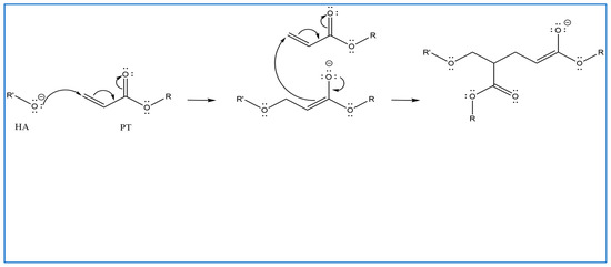 Proposed Michael addition reaction by the activation of the -OH of PT and nucleophiles generation under alkaline conditions; they generate electrons or protons in this Michael reaction (drawn using ChemDraw, version 16).
