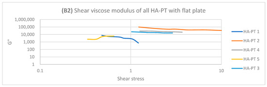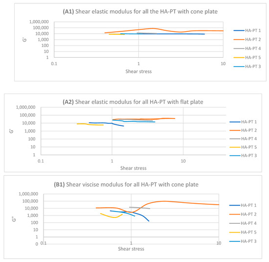 Logarithmic plot of the amplitude sweep for all HA-PT 1, 2, 3, 4 and 5 formulations with cone and flat plates. (A1) Shear elastic modulus (G′) plot vs. shear stress with cone plate. (A2) Shear elastic modulus (G′) plot vs. shear stress with flat plate. (B1) Shear viscose modulus (G″) plot vs. shear stress with cone plate. (B2) Shear viscose modulus (G″) plot vs. shear stress with flat plate.