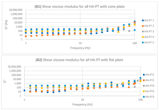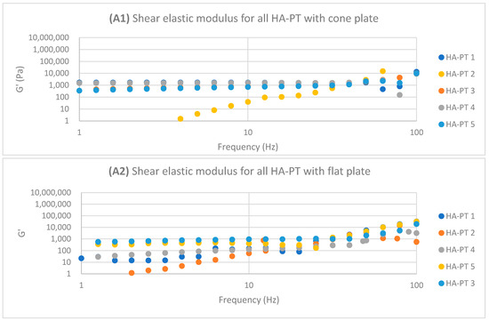 Logarithmic plot of the frequency sweep for all HA-PT 1, 2, 3, 4 and 5 formulations with cone and flat plates. (A1) Shear elastic modulus (G′) plot vs. frequency with cone plate. (A2) Shear elastic modulus (G′) plot vs. the frequency with flat plate. (B1) Shear viscose modulus (G″) plot vs. frequency with cone plate. (B2) Shear viscose modulus (G″) plot vs. frequency with flat plate.