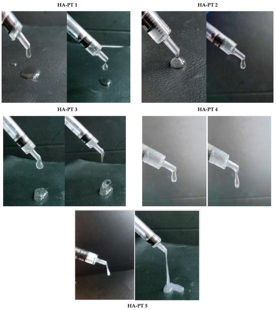 The physical, visual appearance and flowability in the syringe, the viscosity and the thickness of the HA-PT injectable hydrogel/filler formulations are shown below in Figure 7. It also provides visual evidence of the formulation coming out of the syringe. Wongprasert et al. [2] represented the viscosity of the injectable hydrogel/filler schematically; our study provides actual images of the formulations with varying viscosities, which are promising for a wide range of applications. HA-PT 1 appeared to have the lowest viscosity comparing to all the other formulations, while the HA-PT 3 had the highest viscosity. HA-PT 4 and 5 appeared to be more elastic due to the higher % of crosslinker, and this was also confirmed with a rheological study.