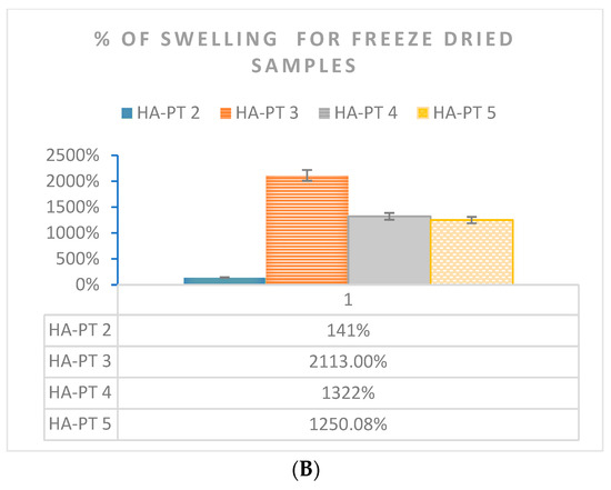 Regarding the swelling study via freeze drying prior to the swelling of the injectable hydrogel/filler samples, it was found that HA-PT 3 had (2113%) a higher % of swelling than all the other HA-PT samples; this is explained due to the higher concentration of HA, which means it was able to absorb more water in the structure, while the low crosslinker ratio imparted a less-elastic structure [33]. Moreover, the HA-PT 2 sample showed 140.80% swelling, which was the lowest among the HA-PT 3, 4 and 5 samples. However, the main reason for the higher % of swelling after freeze drying in comparison to the gel centrifuge method is that freeze drying the samples dries them, so they do not have any moisture in their dry structure, and during the swelling process, they take more water to their structure to convert to a gel form. Therefore, the concentration of HA polymer has a large impact on the swelling ratio, as shown in Figure 8. HA-PT 1 was difficult to measure the swelling of it because having a low HA concentration impeded the isolation of the swelled supernatant. Many researchers have chosen to study swelling using either method; therefore, we selected both methods for the swelling study to easily compare data and provide a wider understand of both the methods [33,37].