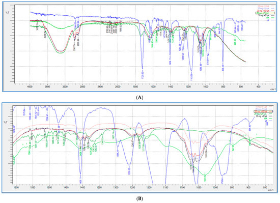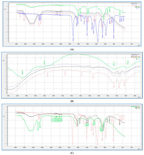 FTIR analysis (shown in Figure 9 and Figure 10) was performed for all the HA-PT injectable hydrogel/filler formulations, pure HA and pure crosslinker (PT), to explore the molecular interactions inside the formulation polymer matrix [38]. Figure 10 illustrates the FTIR spectra of all the HA-PT injectable hydrogel/filler formulations, pure HA and pure PT, which show HA polymer crosslinking with PT via possibly an ester bond (C-O-C) between the hydroxyl group of the HA and the carbonyl carbon of the crosslinker PT present around 1050–1100 cm−1. Moreover, the stretching peak around 1100–1300 cm−1 referring to (C-O-C) is the new bond (crosslink) between HA and PT in the injectable hydrogel/filler formulations. By looking more closely at the stretched peak around 1050–1100 cm−1, in each injectable hydrogel/filler formulation sample, which is represented in the enlarged (Figure 10B), it appears that HA-PT 1 and 2 stretched the least, while HA-PT 4 and 5 had a more-stretched peak due to the larger concentration of crosslinker in these injectable hydrogel/filler formulations. However, the HA-PT 3 formulation’s peak (Figure 9D) was more stretched; this is because the higher concentration of HA in the formulation with more functional groups in the HA allowed it to uptake of all the PT added in the formulation without leaving any PT monomer uncrosslinked. This is similar for HA-PT 2 (Figure 9C). On the other hand, the peaks around 2900–3300 cm−1 shown for in all the HA-PT injectable hydrogel/filler formulations stretched, suggesting a polymer hydroxyl vibration region [39].