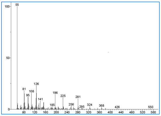 The previous studies have documented the maximum acceptable residual PT concentration based on the polymer used to produce a hydrogel. Accordingly, in this study, the maximum acceptable residual PT and crosslinker concentration after recalculating using the density of the used polymer (HA; 1.80 g/mL) was found to be 0.008% w/w [22]. This amount is valid for hydrogel formulations after taking in account the polymer density. The molecular mass of the PT ion was identified by using GC-MS spectra (Figure 12), and it matches the mass spectra in the literature [43]. HexA was selected as a suitable internal standard solution as it shares a similar chemical structure with PT, and its retention time does not interfere with the PT peaks.