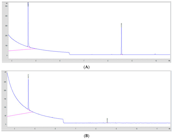 The GC chromatograms of the detected PT monomers. (A) A GC chromatogram showing the PT peak detected in a standard solution. The PT monomer peak at 8.55 min retention time (RT). The IS internal solution (HexA) peak was at 4.67 min retention time (RT). (B) A GC chromatogram showing the PT peak in a sample extraction solution of residual PT in the formulations. The crosslinker (PT) monomer peak was at 8.55 min retention time (RT), while the IS internal solution (HexA) peak was at 4.66 min retention time (RT).