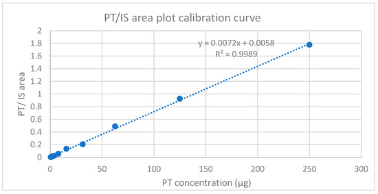 The good linear relationship shown in Figure 14 between the peak area ratio of PT to HexA (IS) vs. the corresponding concentration was determined from ten standards ranging from 0.0166 to 0.000032% w/w, as detailed in the methodology, Section 4.9.3 Standard Solutions and the Calibration Curve. However, below the figure, the calibration curve obtained from the mean of three injections of each extracted injectable hydrogel/filler sample solution with a regression coefficient (R2 > 0.998) is shown, which was used to determine the LOD and LOQ [45]. In addition, the obtained calibration curve concentration range covered a wider range of limit of the residual PT.