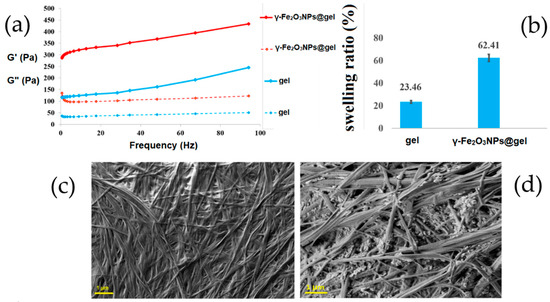 (a) Frequency sweep of the gel and γ-Fe2O3NPs@gel; (b) swelling abilities of the gel and γ-Fe2O3NPs@gel; SEM images of: (c) the gel and (d) γ-Fe2O3NPs@gel.