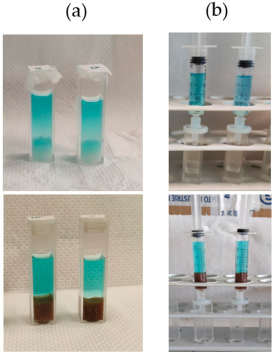 The two different set-ups used for the removal studies of organic dyes from water: (a) employing cuvettes and (b) employing syringes.